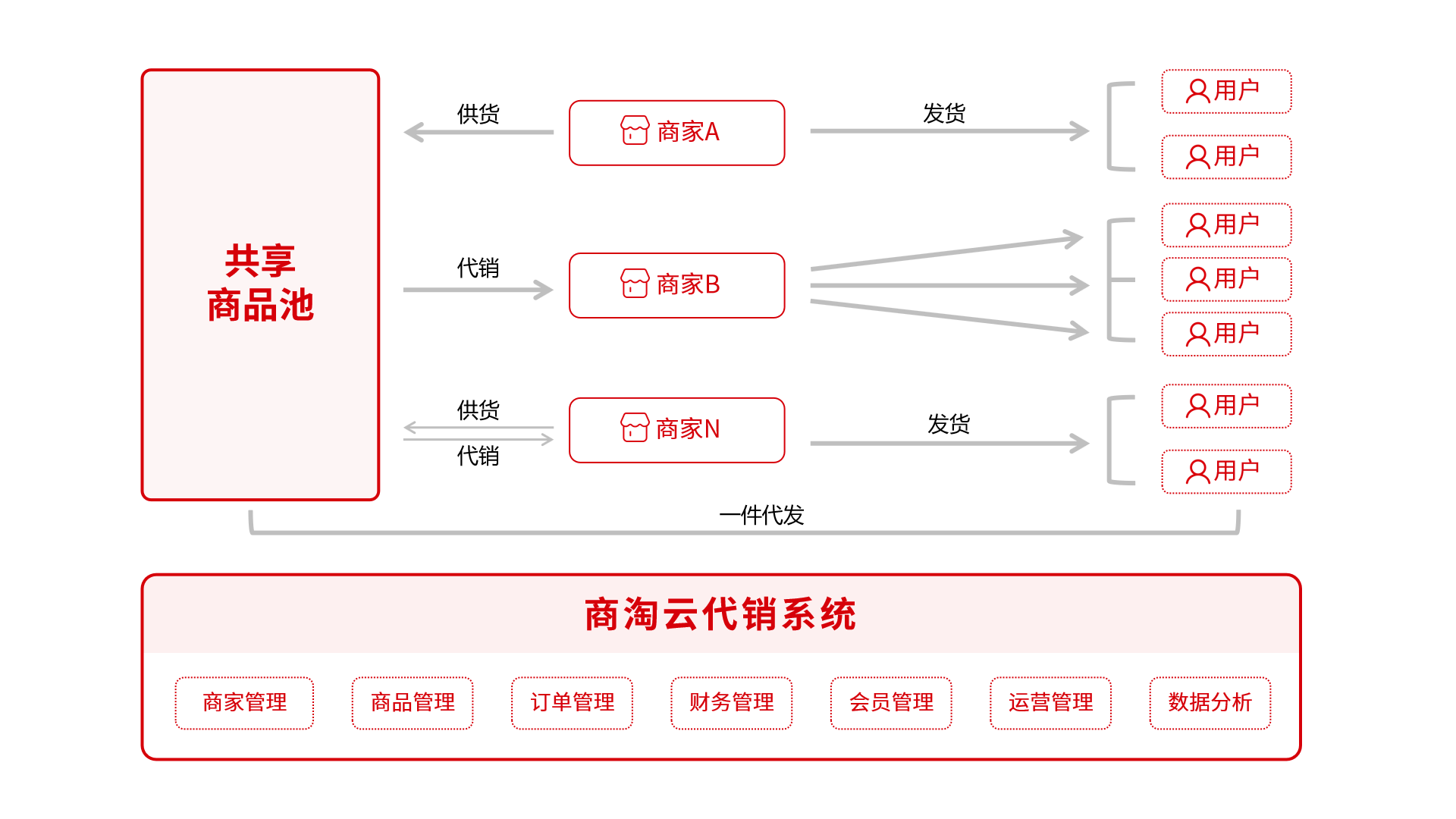 代销模式是指商家或平台通过与第三方合作,借助其他平台和渠道进行销售。与传统的自营模式不同,代销模式让平台不仅限于自己的渠道,而是将商品通过更多的渠道进行推销,从而扩大流量来源。通过智能代销平台,商家可以将产品通过社交媒体、短视频平台等精准投放给潜在消费者,同时平台利用数据分析推送适合的产品给精准用户,进一步提升流量转化率。代销不仅能有效突破平台的流量瓶颈,还能通过与其他平台的合作获得更多市场曝光,提升品牌的知名度和影响力。